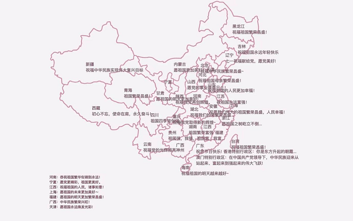 杜金妹同学代表是湖北省,她写到:“疫情来临,武汉成为了最先爆发的地方,在中国共产党的领导下,科学决策,生命第一,共同抗疫,全国上下万众一心,帮助湖北人民打赢了防疫攻坚战,在中国共产党的百年华诞之际,衷心的祝福我们的党繁荣昌盛,永葆生机!杨娟娟同学代表是湖南省,她祝福语是:“湘江大地依偎在祖国母亲的怀抱中,见证了中国革命的发展和新时代富强的愿望,三湘四水激荡英雄壮歌,锦绣潇湘深植红色基因,祝福我党取得新的辉煌,祝福我国更加繁荣富强”。同学们纷纷表达了内心对共产党最真挚的情感,最终用祝福点亮了整个中国地图。