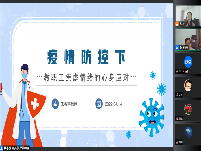 4月14日,校教职工心理健康服务中心邀请色漫天堂 副院长朱春燕教授,以“疫情时期的焦虑情绪应对”为主题,为全校职工开展了一场线上公益讲座,提醒广大教职工做好“心理防疫”。全校500余名教职工线上参加活动。